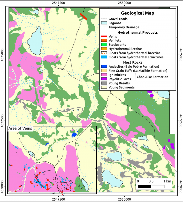 This project includes several siliceous veins that are concentrated in its southwestern portion, and that add up a total of around 3500 linear meters, in a partially discontinuous way. In addition, there are several stockworks and rock outcrops crossed by disseminated veinlets. Most of the veins follow a northwest orientation, although a few are oriented to the northeast; they have widths that locally exceed two meters; and they show a variety of quartz textures, including: massive, saccharoidal, replacement, and comb; and some of them also include considerable amounts of breccias with fragments from previous veins, and abundant iron oxides in their cement.